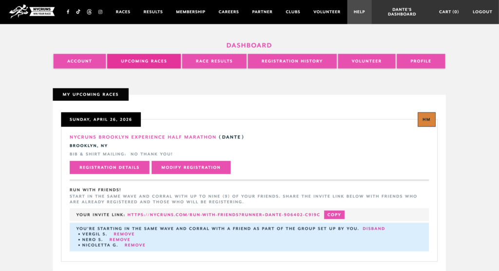 Invite Your Friends – Share the unique RUN WITH FRIENDS link that appears on your post-checkout page after you register for the race and on the Upcoming Races section of your NYCRUNS Dashboard. You can invite up to nine (9) runners to join your group.